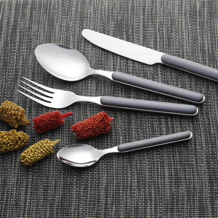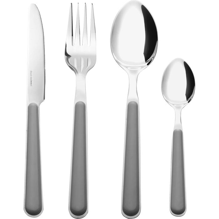 Grå Delice bestiksæt af rustfrit stål med gråt /n plast greb, 16 dele: 4 knive 4 gafler 4 skeer 4 /n teskeer Tåler maskinopvask.