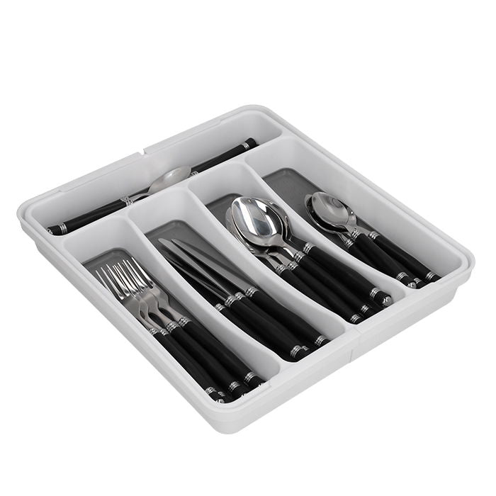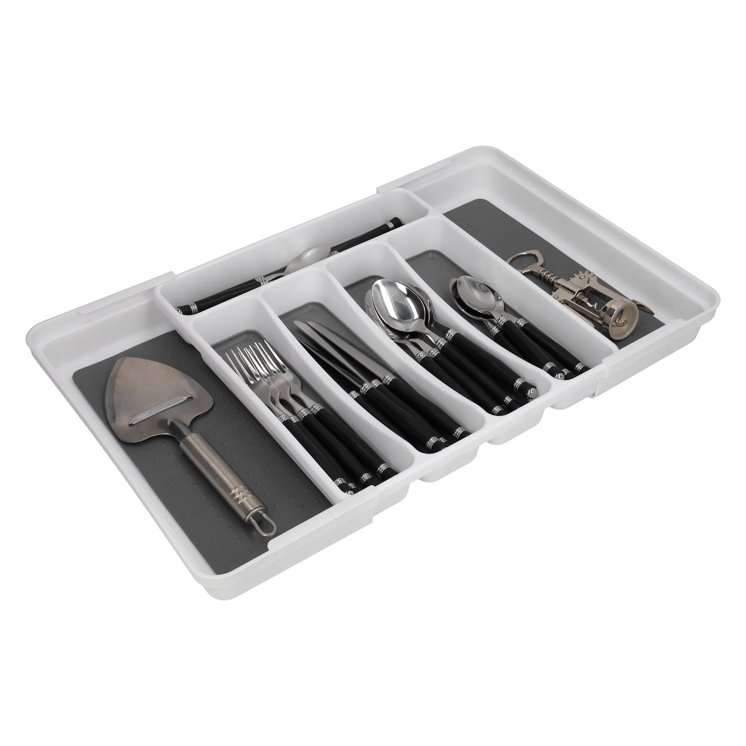 Haba Spacer bestikbakke, justerbar. En justerbar /n bestikbakke er den ideelle løsning til at holde /n styr på bestikket. Med en justerbar bredde fra 30 /n til 52 cm kan bakken tilpasses enhver skuffe, og /n den indeholder fem rum med skridsikker bund, der /n holder bestikket på plads. Ved udvidelse får du /n to ekstra rum, og de skridsikre puder i bunden /n sørger for, at bakken står stabilt.