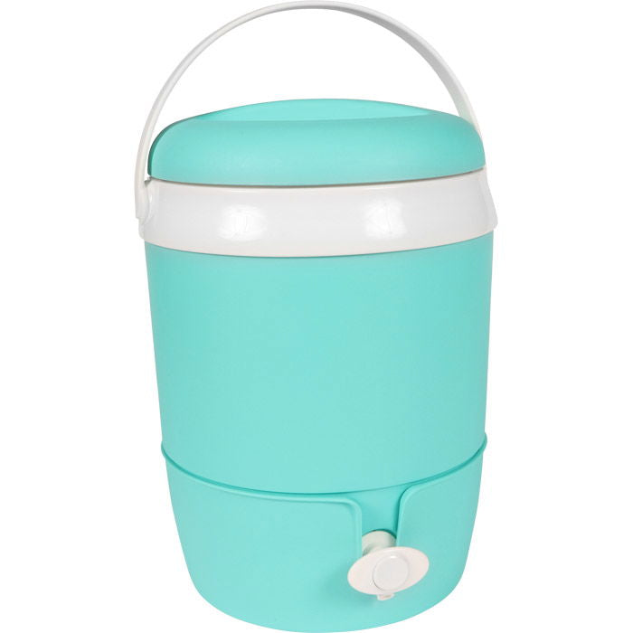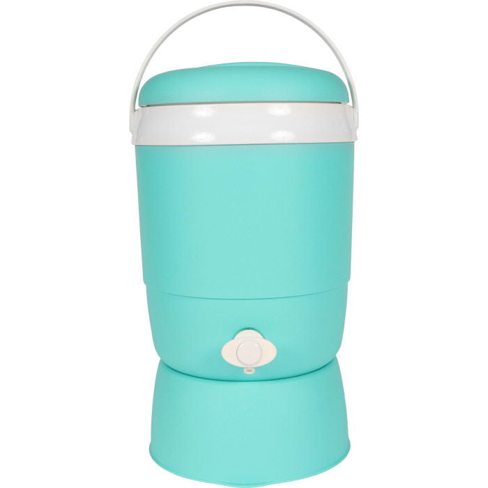 Drikkedunk, 6 liter. Model: Turkis. Meget smart /n drikkedunk med aftapningshane. Bundstykket kan /n vendes, og drikkedunken kan dermed hæves, hvilket /n gør det lettere at tappe væske. Praktisk håndtag /n gør det nemt at tage dunken med på tur. Mål: Ø 23 /n x H 32 cm. Leveres i kasse med 6 stk.