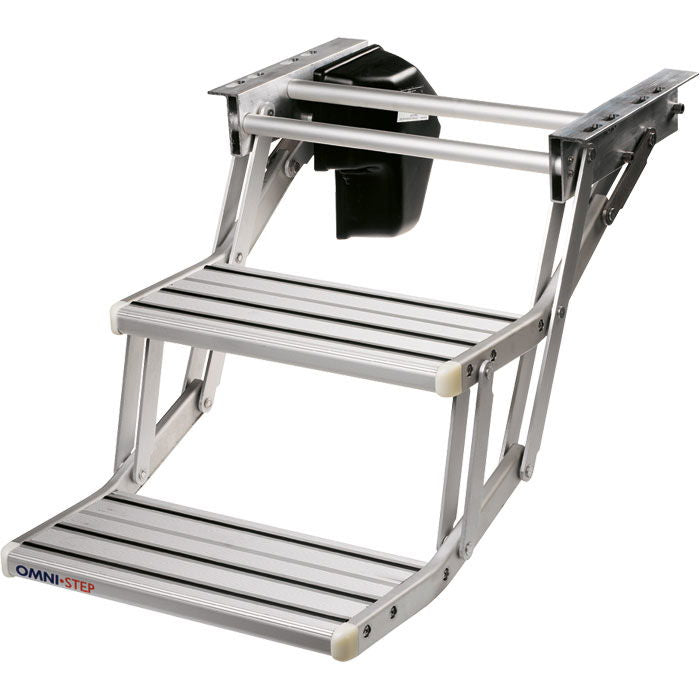 Omni-Step 12 V double 500 trappetrin, dobbelt. /n Elektrisk til fastmontering - ved tryk på knap /n kører trappetrinnene automatisk frem fra / op /n under caravanen / motorcaravanen. Skridsikker /n profilaluminium, anodiseret ophæng. Trinnets mål: /n B 50,2 x D 20,0 cm. Vægt: 7,6 kg.