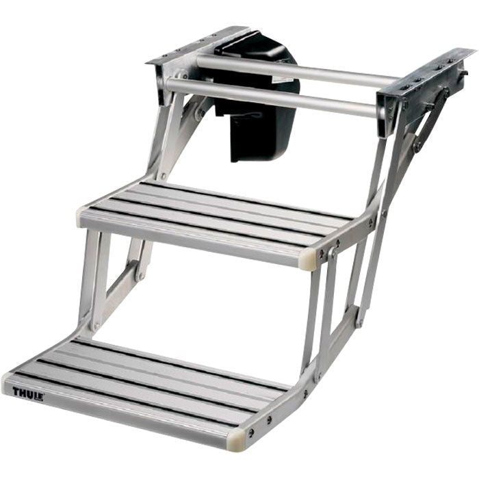 Omni-Step 12 V trappetrin, dobbelt. Elektrisk til /n fastmontering - ved tryk på knap kører /n trappetrinnene automatisk frem fra / op under /n autocamper. Skridsikker profilaluminium, /n galvaniseret ophæng. Trinnets mål: B 38 x D 20,0 /n cm. Vægt: 7 kg.