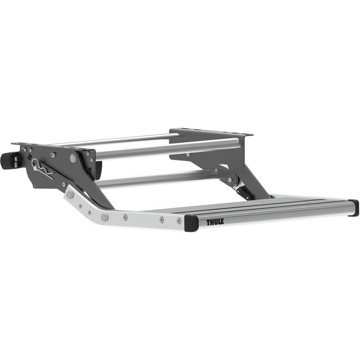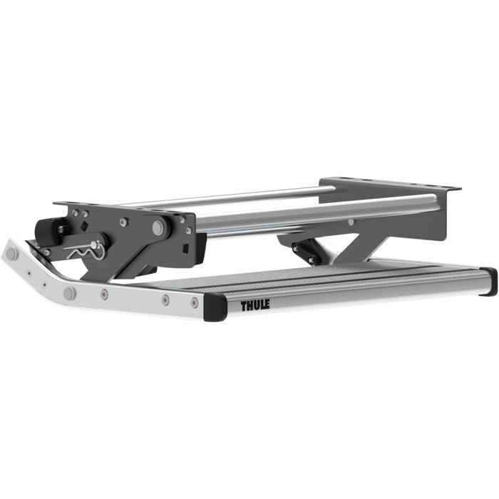 Compact 12V trappetrin, enkelt. Til fastmontering /n - kan klappes op under køretøjet. Lydsvag og /n fremstillet af skridsikker profilaluminium, /n anodiseret ophæng. Max belastning: 300 kg. Mål: /n B50 cm. Vægt: 5,1 kg.
