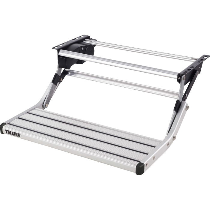 Omni-Step 12V trappetrin, enkelt. Til /n fastmontering - kan klappes op under /n campingvognen/køretøjet. Fremstillet af /n skridsikker profilaluminium, anodiseret ophæng. /n Trinnets mål: B 55,1 x D 26,5 cm. Vægt: 5,35 kg.