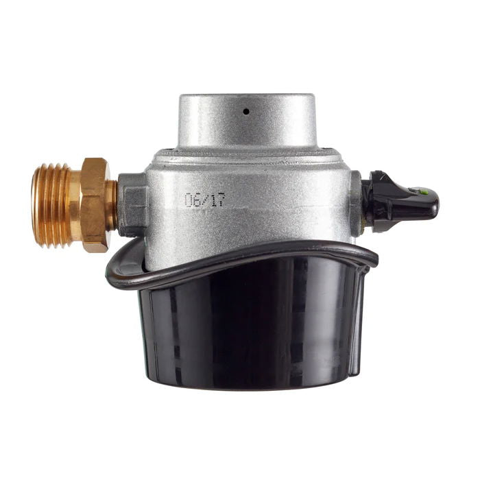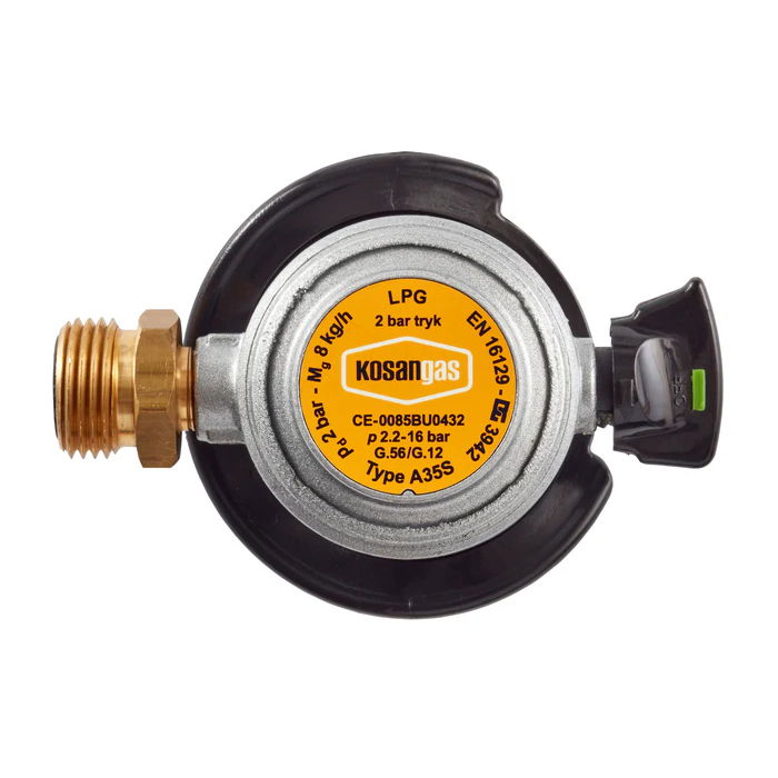 Gasflaskekobling til flasker med click-on-ventil /n samt tysk gevind afgang. /n Afgangstryk: 2 bar. /n Tilgang: Click-on-ventil.