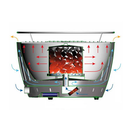 Lilla Den prisvindende Lotus Grill i en større /n udgave med diameter 43,5 cm. Lotus Grill XL har /n batteridrevet blæsesystem, der dels sørger for, /n at grillen er klar til brug efter få minutter og /n dels anvendes til at styre grillens temperatur /n med. Grillens ydre bliver aldrig varm, så du kan /n flytte med grillen, selvom den er tændt op. Den /n medfølgende taske gør det ekstra nemt at have /n grillen med overalt. Lotus Grill er designet, så /n fedt fra kødet ikke drypper ned på kullene. /n Derved undgås udviklingen af de sundhedsskadelige /n stoffer, der nogle gange udvikles med /n konventionelle grill. Derudover kan temperaturen /n reguleres, så man undgår, at maden brændes på. /n Lotus Grill er fremstillet af 100% genanvendelige /n materialer. Grillristen og den inderste skål kan /n maskinvaskes. Se vejledning under næste faneblad. /n Inkl. taske og batteri. Mål: Ø 43,5 x H 25,7 cm.