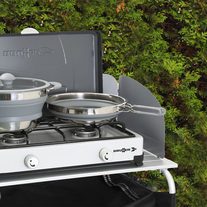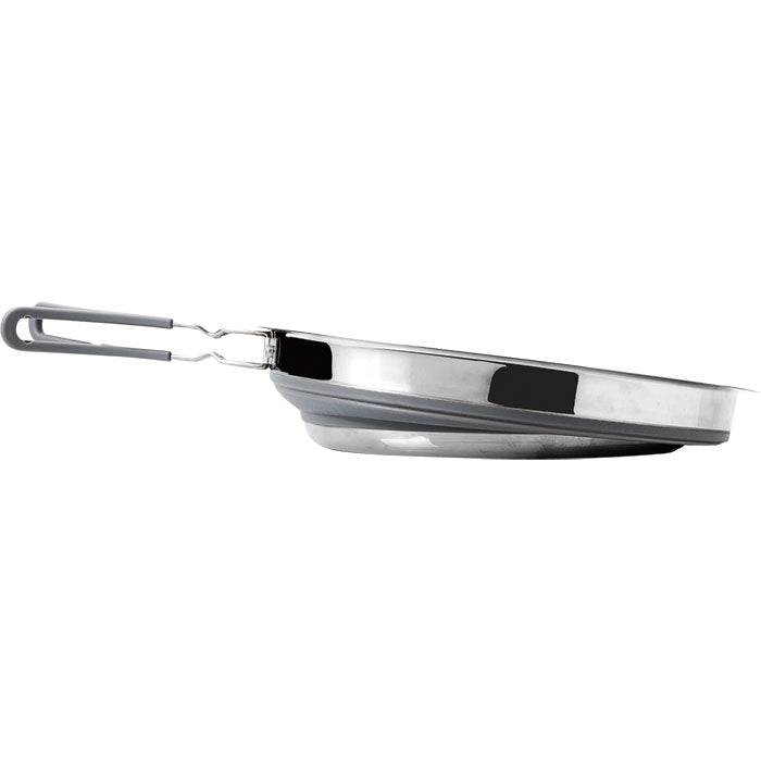 Foldbar pande, Volcano, Ø24 cm. Foldbar pande, /n som kan anvendes både på gas- og elektriske /n komfurer. Panden er fremstillet i rustfrit stål /n og silicone og har en non-stick overflade. Kan /n foldes så den fylder minimalt ved opbevaring. /n Mål: Ø24 cm.