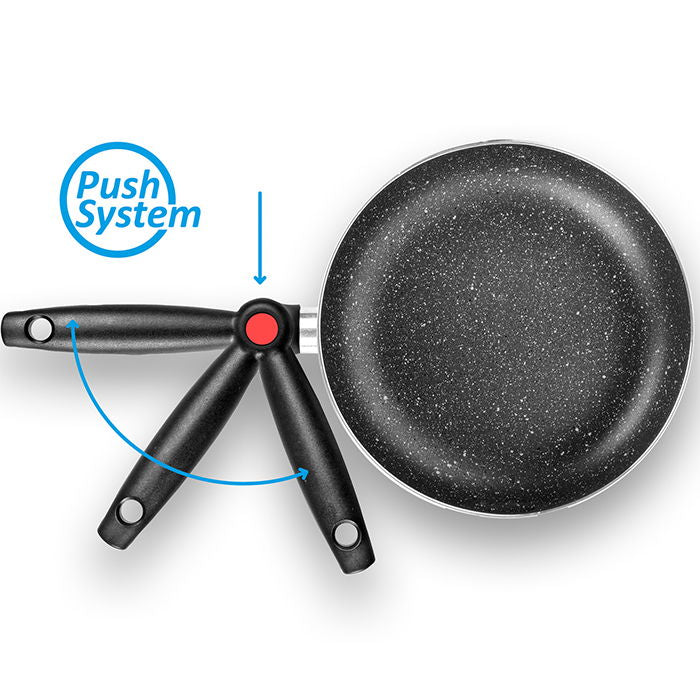 Ø 24 cm Pande i aluminium med slidstærk slip-let /n coating der ikke nemt modtager ridser, men er nem /n at rengøre. Klapbart greb, så den fylder mindst /n muligt under opbevaring.