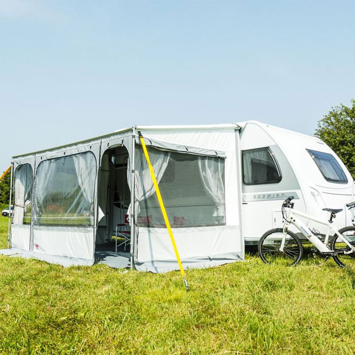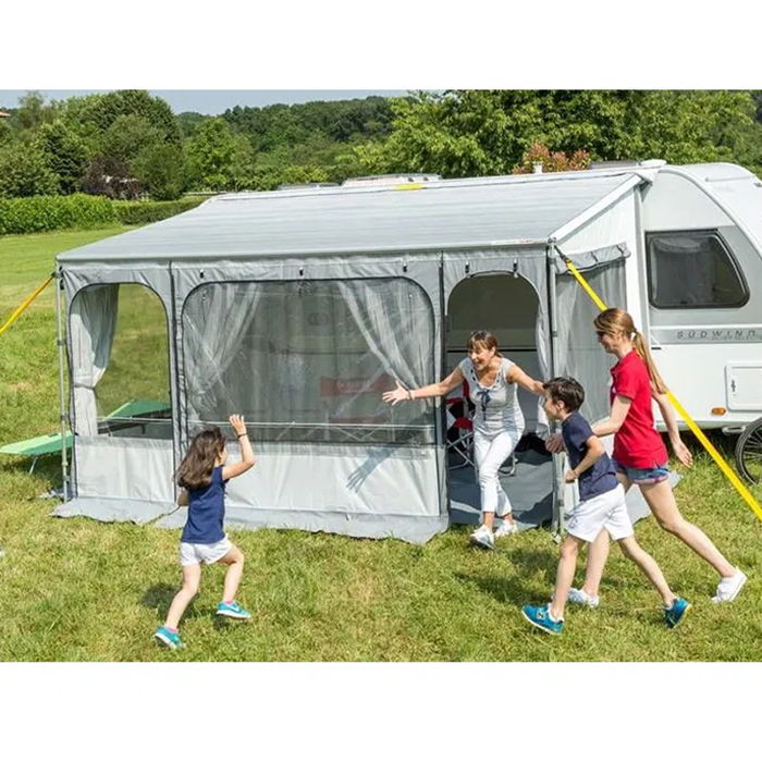 Caravanstore ZIP XL Royal Grey, L 4,40 m. Mål: D /n 2,50 x L 4,14 m (markisedug). Vægt: 35,6 kg. /n Komplet sæt bestående af posemarkise, front og to /n sider. Fronten har stort vindue samt indgangsdør. /n Begge sider har myggenet og vindue, der kan /n åbnes.