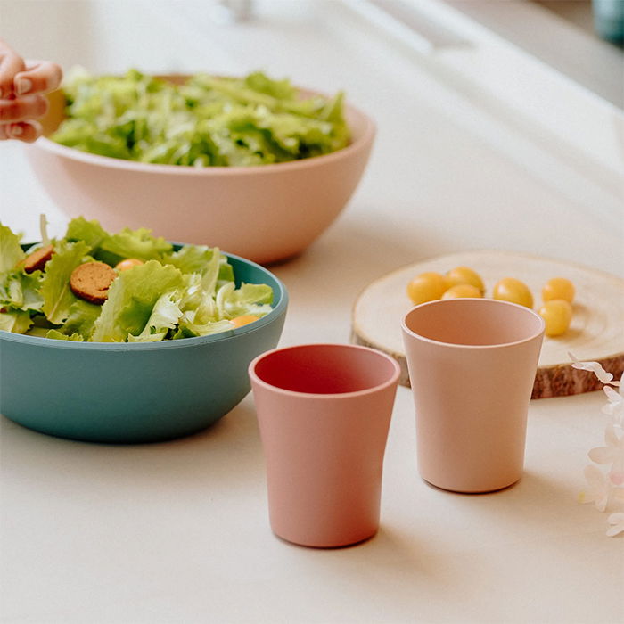 Omada Re-Amo krus, 30 cl. 2 stk. Lækkert krussæt /n i 2 rosa nuancer, som er behagelige at holde om. /n Kan tåle maskinopvask ved 55° C. Lavet af /n genanvendte plastflasker der er forarbejdet så /n det er egnet til direkte kontakt med fødevarer og /n 100% genanvendeligt. Nogle farvenuancer eller /n unøjagtigheder på produkterne bør ikke betragtes /n som defekter, men karakteristiske tegn på /n råmaterialets ægthed. Stabelbar og brudsikker.