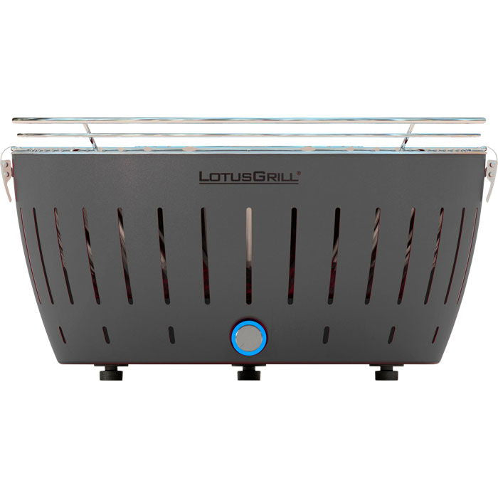 Antracit Den prisvindende Lotus Grill i en større /n udgave med diameter 43,5 cm. Lotus Grill XL har /n batteridrevet blæsesystem, der dels sørger for, /n at grillen er klar til brug efter få minutter og /n dels anvendes til at styre grillens temperatur /n med. Grillens ydre bliver aldrig varm, så du kan /n flytte med grillen, selvom den er tændt op. Den /n medfølgende taske gør det ekstra nemt at have /n grillen med overalt. Lotus Grill er designet, så /n fedt fra kødet ikke drypper ned på kullene. /n Derved undgås udviklingen af de sundhedsskadelige /n stoffer, der nogle gange udvikles med /n konventionelle grill. Derudover kan temperaturen /n reguleres, så man undgår, at maden brændes på. /n Lotus Grill er fremstillet af 100% genanvendelige /n materialer. Grillristen og den inderste skål kan /n maskinvaskes. Se vejledning under næste faneblad. /n Inkl. taske og batteri. Mål: Ø 43,5 x H 25,7 cm.