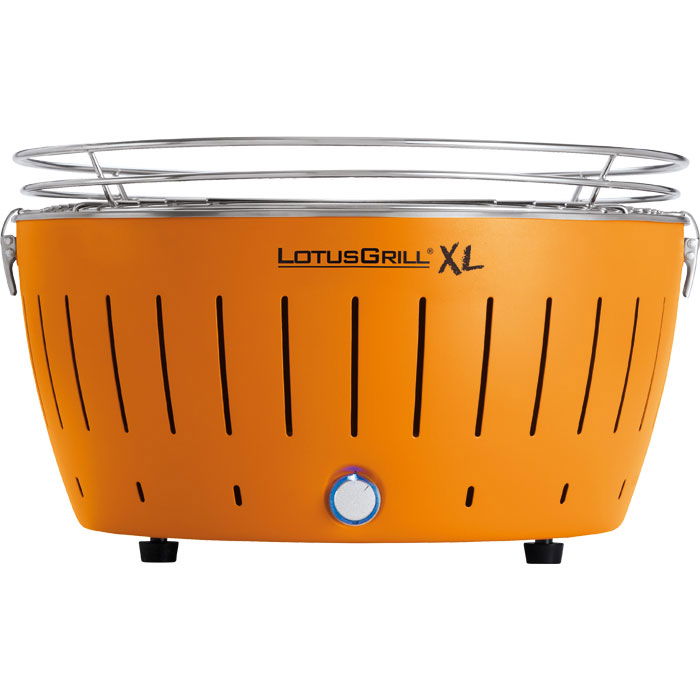 Orange Den prisvindende Lotus Grill i en større /n udgave med diameter 43,5 cm. Lotus Grill XL har /n batteridrevet blæsesystem, der dels sørger for, /n at grillen er klar til brug efter få minutter og /n dels anvendes til at styre grillens temperatur /n med. Grillens ydre bliver aldrig varm, så du kan /n flytte med grillen, selvom den er tændt op. Den /n medfølgende taske gør det ekstra nemt at have /n grillen med overalt. Lotus Grill er designet, så /n fedt fra kødet ikke drypper ned på kullene. /n Derved undgås udviklingen af de sundhedsskadelige /n stoffer, der nogle gange udvikles med /n konventionelle grill. Derudover kan temperaturen /n reguleres, så man undgår, at maden brændes på. /n Lotus Grill er fremstillet af 100% genanvendelige /n materialer. Grillristen og den inderste skål kan /n maskinvaskes. Se vejledning under næste faneblad. /n Inkl. taske og batteri. Mål: Ø 43,5 x H 25,7 cm.