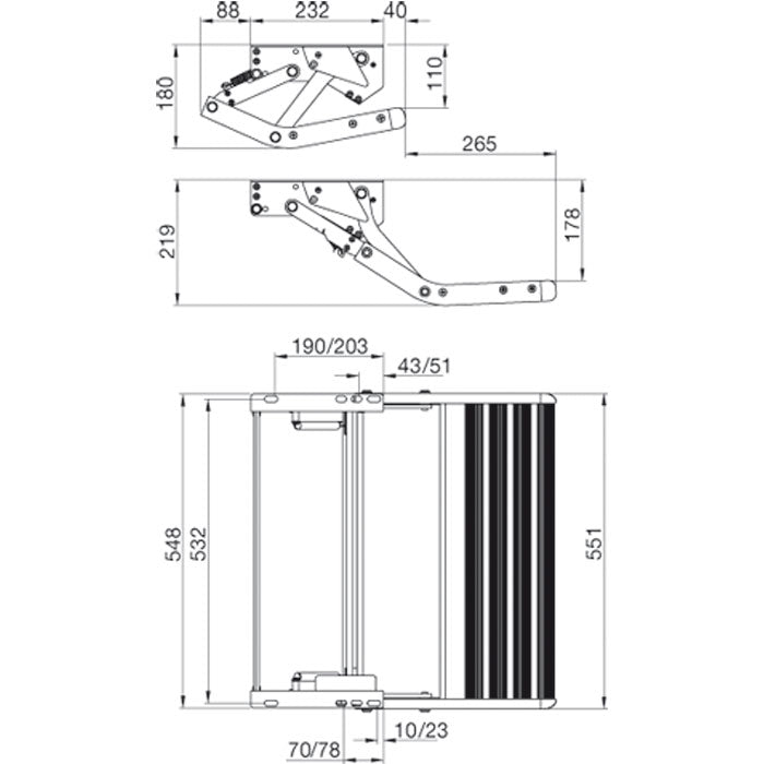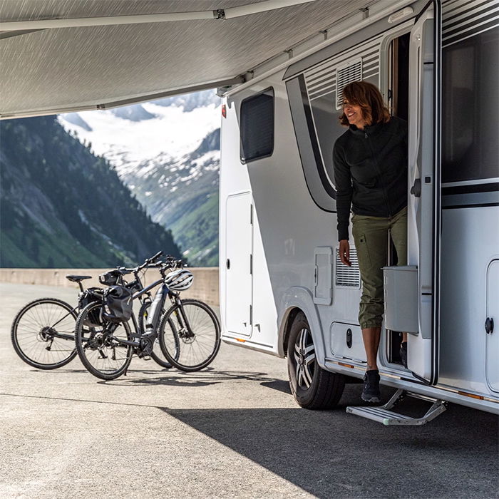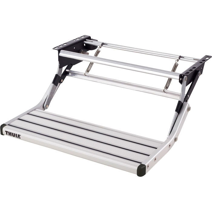 Omni-Step manual 550 trappetrin, enkelt. Til /n fastmontering - kan klappes op under caravanen / /n motorcaravanen. Fremstillet af skridsikker /n profilaluminium, anodiseret ophæng. Trinnets mål: /n B 55,1 x D 26,5 cm. Vægt: 5,35 kg.