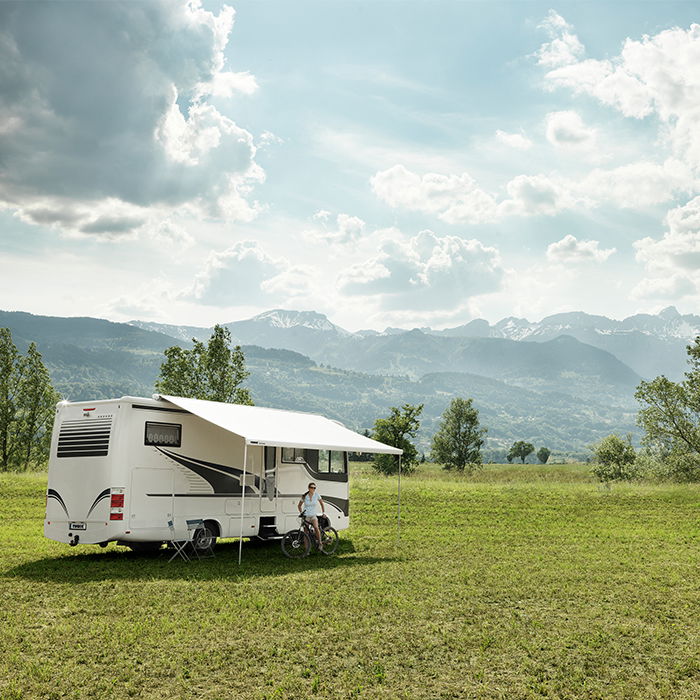 Thule Omnistor markise 9200 L 5,0 m. Mystic grey, hvid boks.