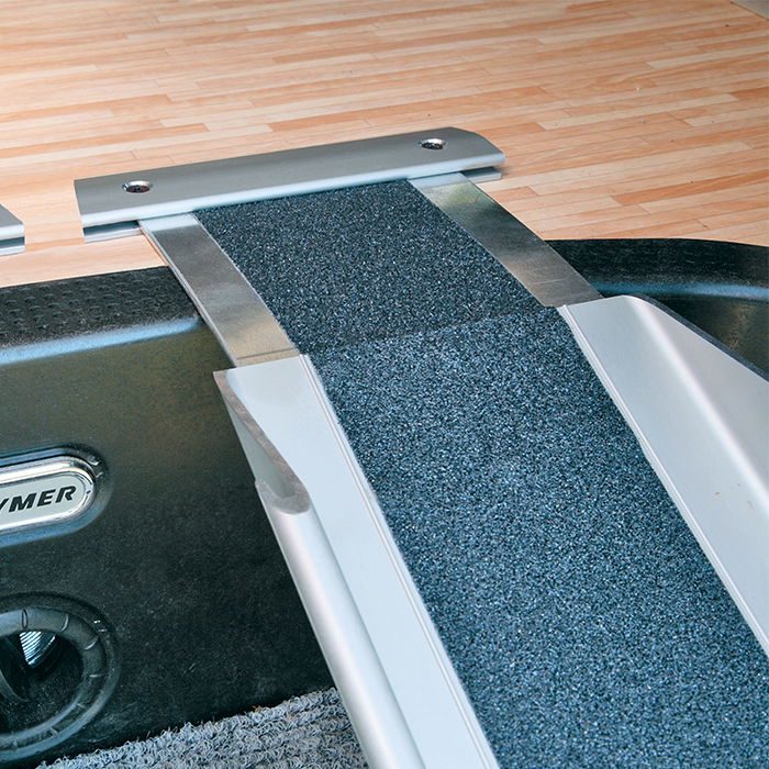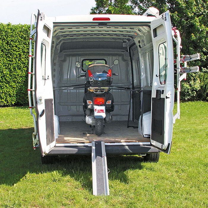 Fiamma Carry Moto S motorcykelrampe. Teleskop /n motorcykelrampe i overfladebehandlet aluminium, /n velegnet til autocamperdøre. Når pladen er /n fastgjort til gulvet, hægtes rampen nemt af og /n på. Den strækker sig op til 175 cm ved /n teleskopisk glidning. Komplet med håndtag. /n Indlæsning skal udføres uden person. Rampen har /n en hældning på 25°. Max højde: 75 cm. Max /n hjulbredde: 15 cm. Vægt: 7 kg. Maks. belastning: /n 130 kg.