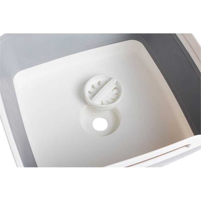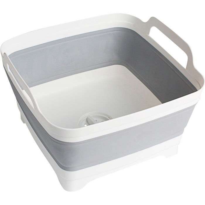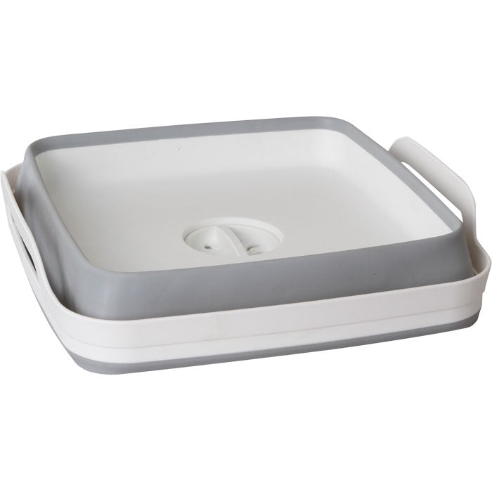 Foldbart opvaskebalje med afløb. Opvaskebalje i /n holdbart plastik. Med indbyggede bærehåndtag og /n afløb med prop. Opvaskebaljen kan foldes, så det /n fylder minimalt under opbevaring. Volume: 9 ltr. /n Mål: 30,5 x 30 x 20 cm. Mål, foldet: 30,5 x 30 x /n 6 cm. Vægt: 0,5 kg.