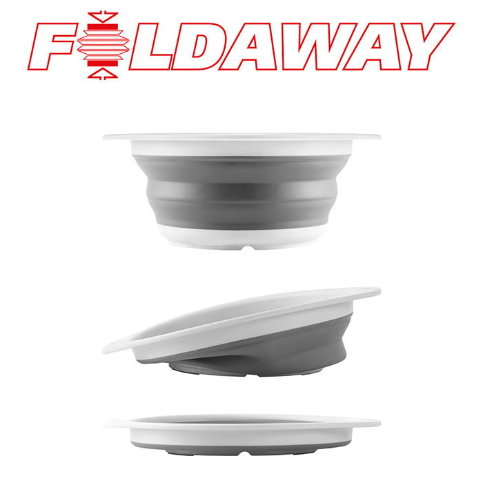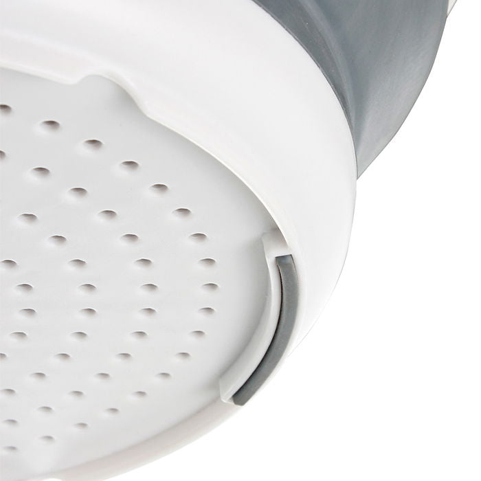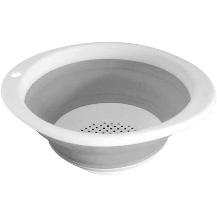 Grå Smart foldbart dørslag til skylning af /n grøntsager, pasta eller andre madvarer - passer /n perfekt ind i det moderne campingkøkken. Tåler /n også varme madvarer. Mål: Ø 22 x H 9 cm. Mål, /n foldet: Ø 22 x H 3,5 cm. Vægt: 220 g.