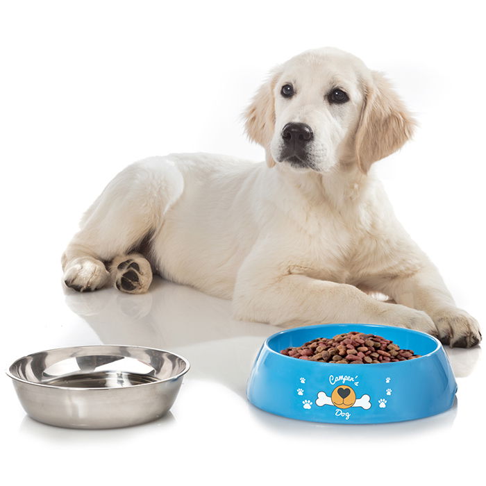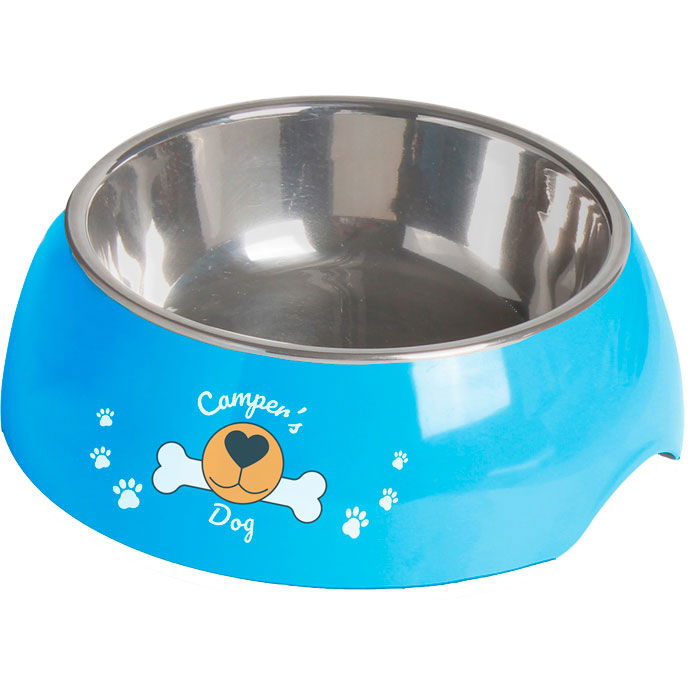 Hundeskål i melamin med rustfri inderskål i stål /n samt skridsikker bund. Perfekt til alle /n campinghunde. Farve: Blå med sødt campingmotiv. /n Mål: Ø 17,5 cm x H6 cm. Leveres i display med 12 /n stk.