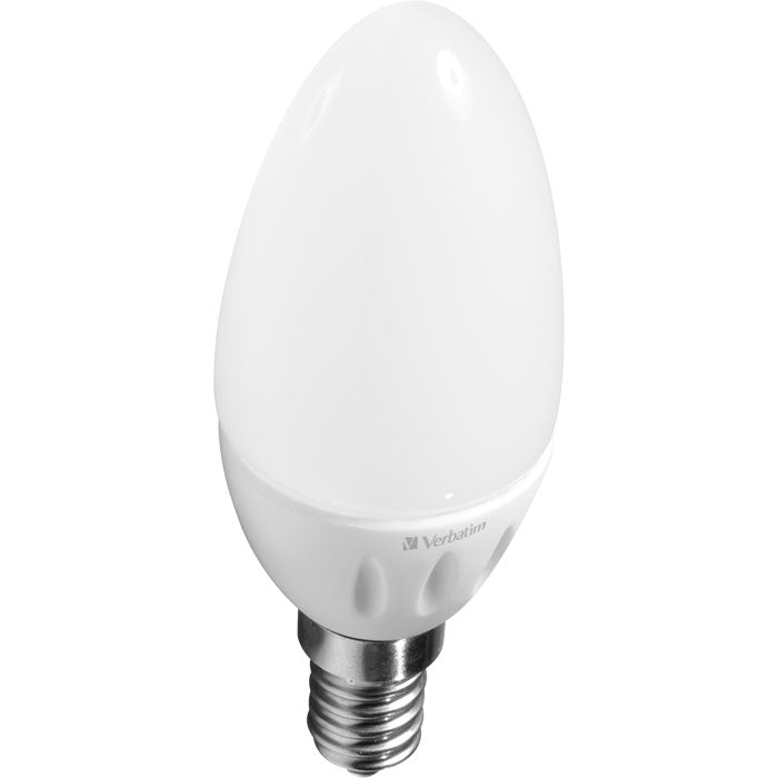 Verbatim LED-kertepære, matteret, 220-240 V. /n Varmt hvidt lys 2700 K, kan ikke dæmpes. /n Lampefatning: E14. Forbrug: 4,5 watt (svarer til /n 25 watt glødepærer). Lumen: 350. Levetid: ca. /n 30.000 timer. Energiklasse A+.