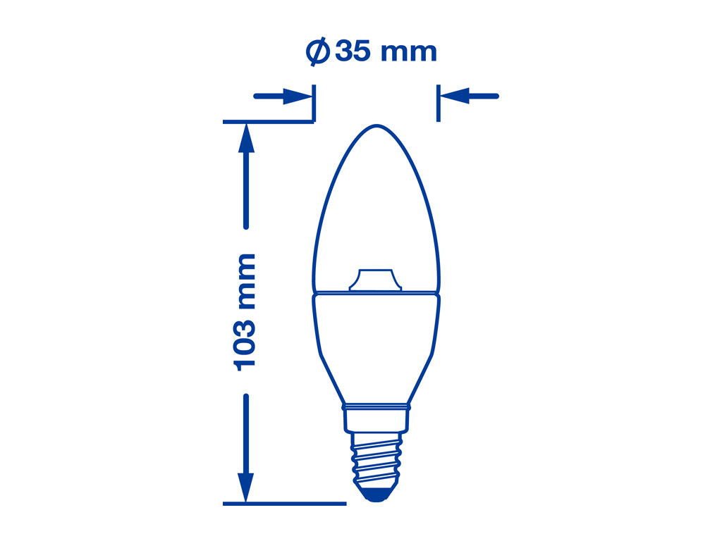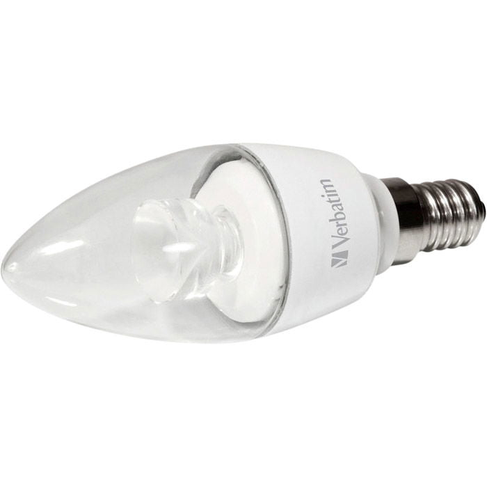 Verbatim LED-kertepære, transparent, 220-240 V. /n Varmt hvidt lys 2700 K, kan ikke dæmpes. /n Lampefatning: E14. Forbrug: 4,5 watt (svarer til /n 25 watt glødepærer). Lumen: 250. Strålevinkel: /n 130°. Levetid: ca. 20.000 timer. Energiklasse A+.
