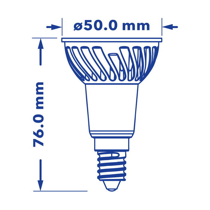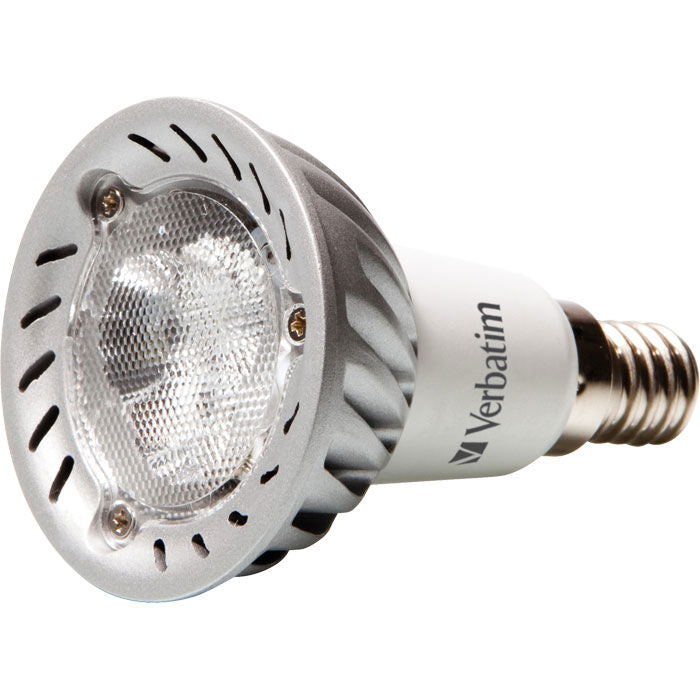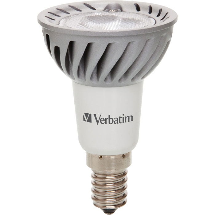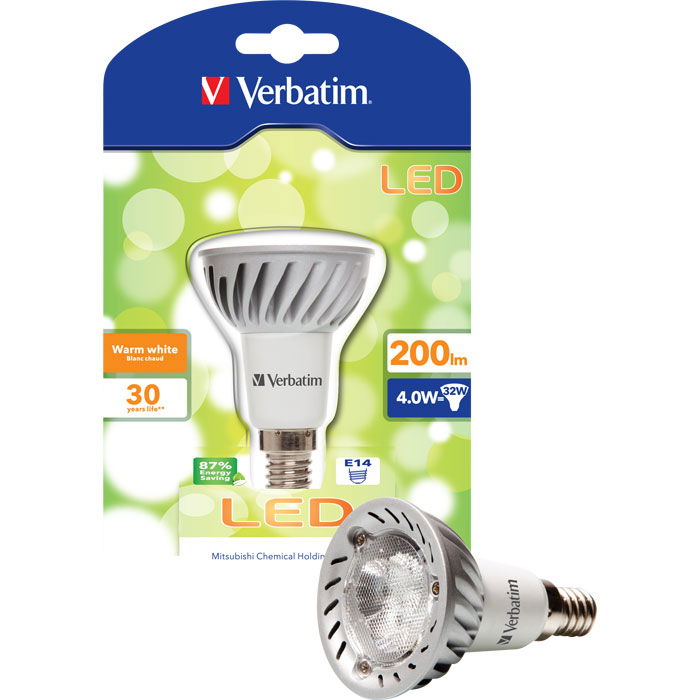 Verbatim LED R50, 220-240 V. Varmt hvidt lys 3000 /n K, kan ikke dæmpes. Lampefatning: E14. Forbrug: 4 /n watt (svarer til 27 watt glødepærer). Lumen: 200. /n Strålevinkel: 20°. Levetid: ca. 30.000 timer. /n Energiklasse A+.