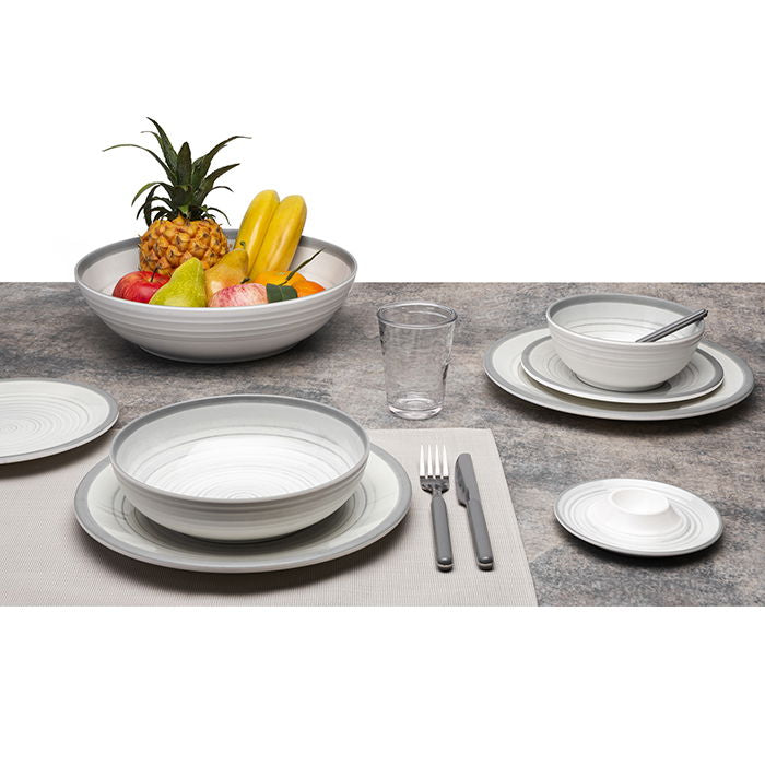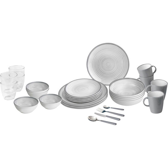 Bellagio VIP servicesæt, melamin. I alt 40 dele: /n 4 flade tallerkener Ø26 cm. 4 dessert tallerkener /n Ø21 cm. 4 dybe tallerkener Ø21 cm. 4 /n portionsskåle Ø15 cm. 4 krus 30 cl. 4 drikkeglas /n 20 cl. 1 bestiksæt - 16 dele.