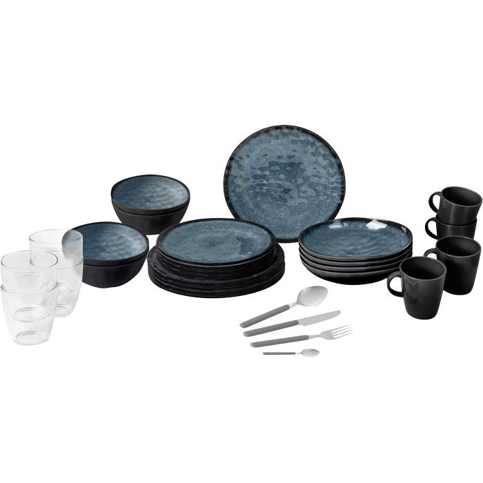 Venetian VIP servicesæt, melamin. I alt 40 dele: /n 4 flade tallerkener Ø25 cm. 4 dessert tallerkener /n Ø21 cm. 4 dybe tallerkener Ø21 cm. 4 /n portionsskåle Ø18 cm. 4 krus 30 cl. 4 drikkeglas /n 20 cl. 1 bestiksæt - 16 dele.