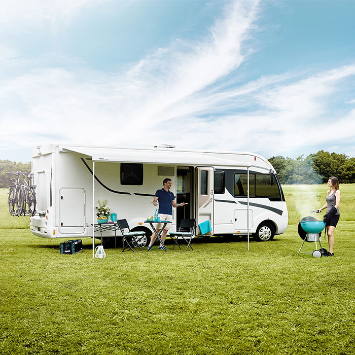 Thule Omnistor markise 5200 L 4,5 m. Mystic grey, hvid boks.