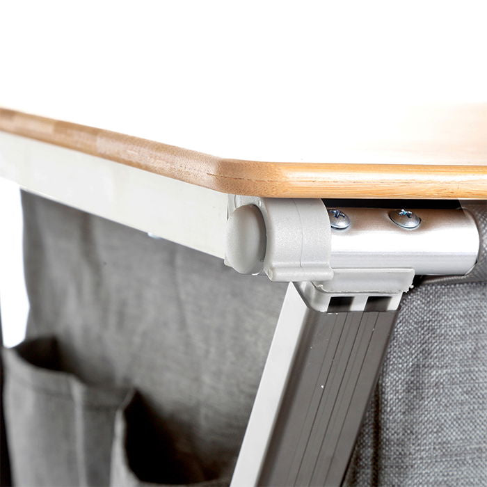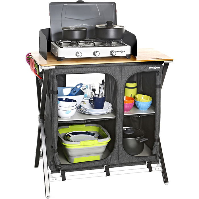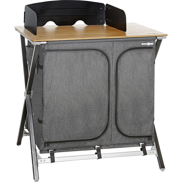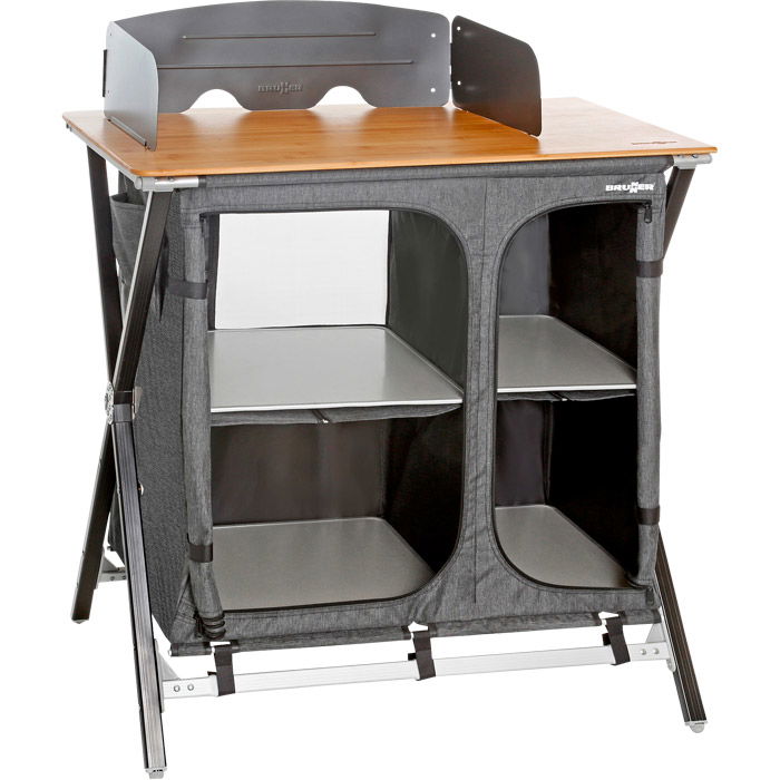 Campingskab, dobbelt. Model: Cross Cooker HWT SQ. /n Campingskab med arbejdsbord i bambus og /n afskærmning. Skabet er opdelt i to sektioner - /n hver sektion med to hylder. Slidstærkt stel i /n aluminium. Kan foldes sammen. Opbevaringstaske /n medfølger. Med justerbare fødder. Mål: L92 x B49 /n x H90 cm. Mål, foldet: L93,5 x B11 x H57 cm. /n Vægt: 10,9 kg.