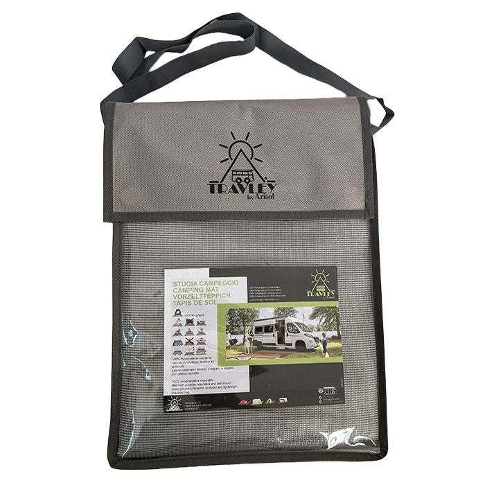 Travley markisetæppe er fremstillet af 100% /n genanvendt polypropylen og vejer kun 200 g/m2, /n hvilket gør det både stærkt, let og kompakt. Det /n leveres i en praktisk skuldertaske, specielt /n designet til Van, og passer perfekt til de mest /n populære størrelser af markiser til Van. Vaskbart /n og åndbart. Farve: Grå. Mål: B2,5 x L2,6 m. Vægt: /n 1,35 kg.