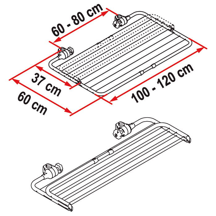 Easy Dry er et tørrestativ til Fiamma Carry-Bike, /n der er nemt at montere på de fleste cykelholdere /n med rørdiameter 35 mm - også andre end Fiamma. /n Det klemmes fast på nederste del af /n cykelholderen. Tørrestativet kan klappes op, så /n man kan køre med det monteret. Det er heller ikke /n nødvendigt at fjerne tørrestativet, selvom der /n skal cykler på cykelholderen. Mål: L 100-120 x D /n 37/60 cm. Vægt: 1,2 kg.